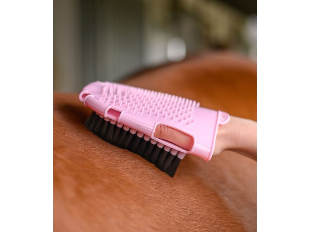 Čistiaca rukavica vhodná na umývanie koňa. Z jednej strany syntetické štetiny z druhej strany gumené výstupky.